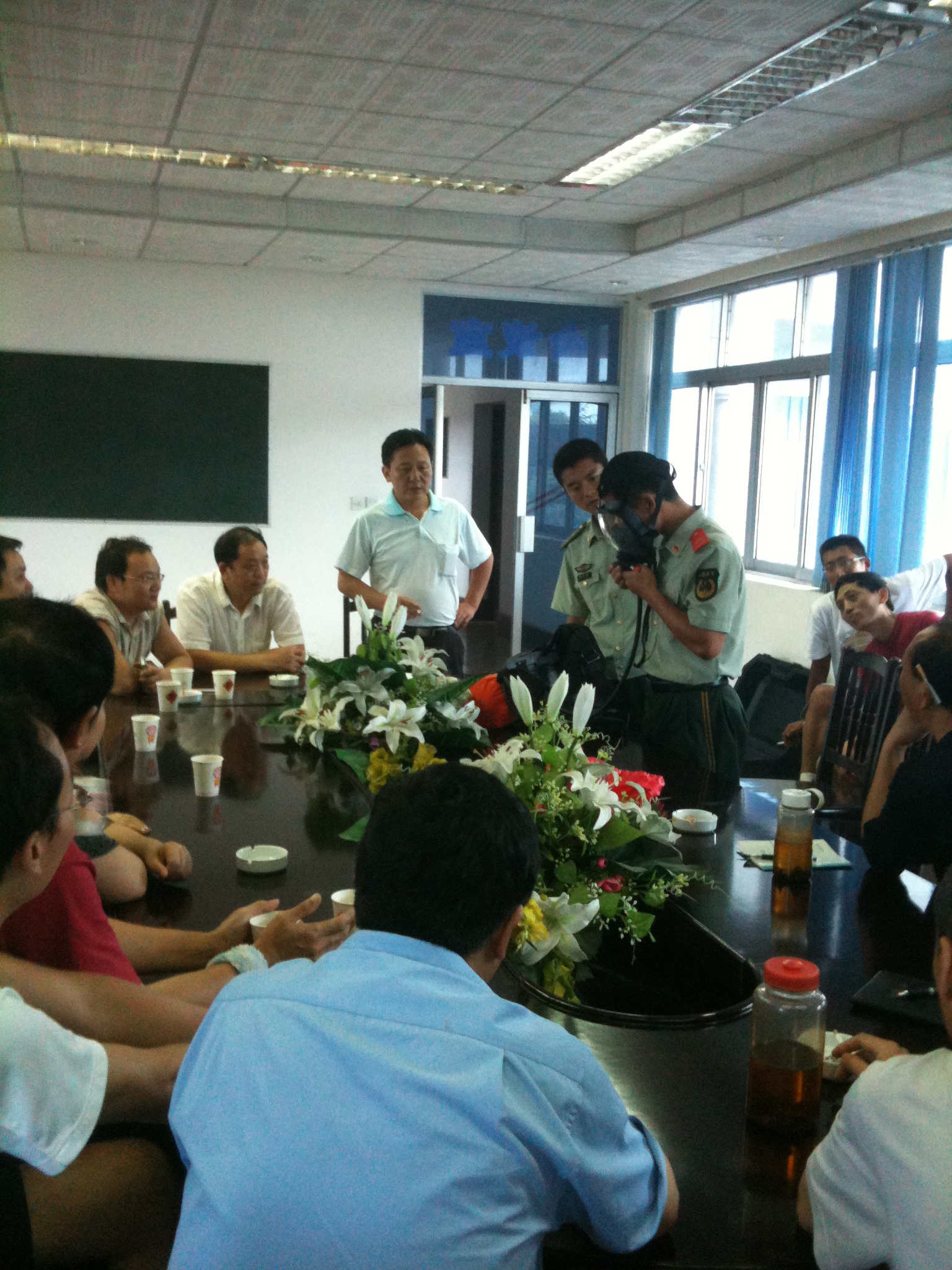 武警為職工演練防毒器具使用方法