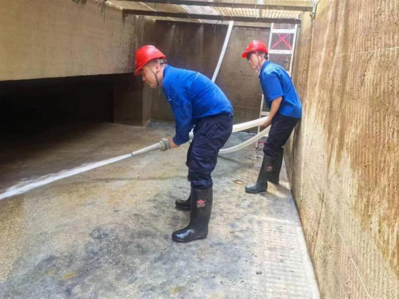 上圖為水廠維修人員正在清洗絮凝沉淀池