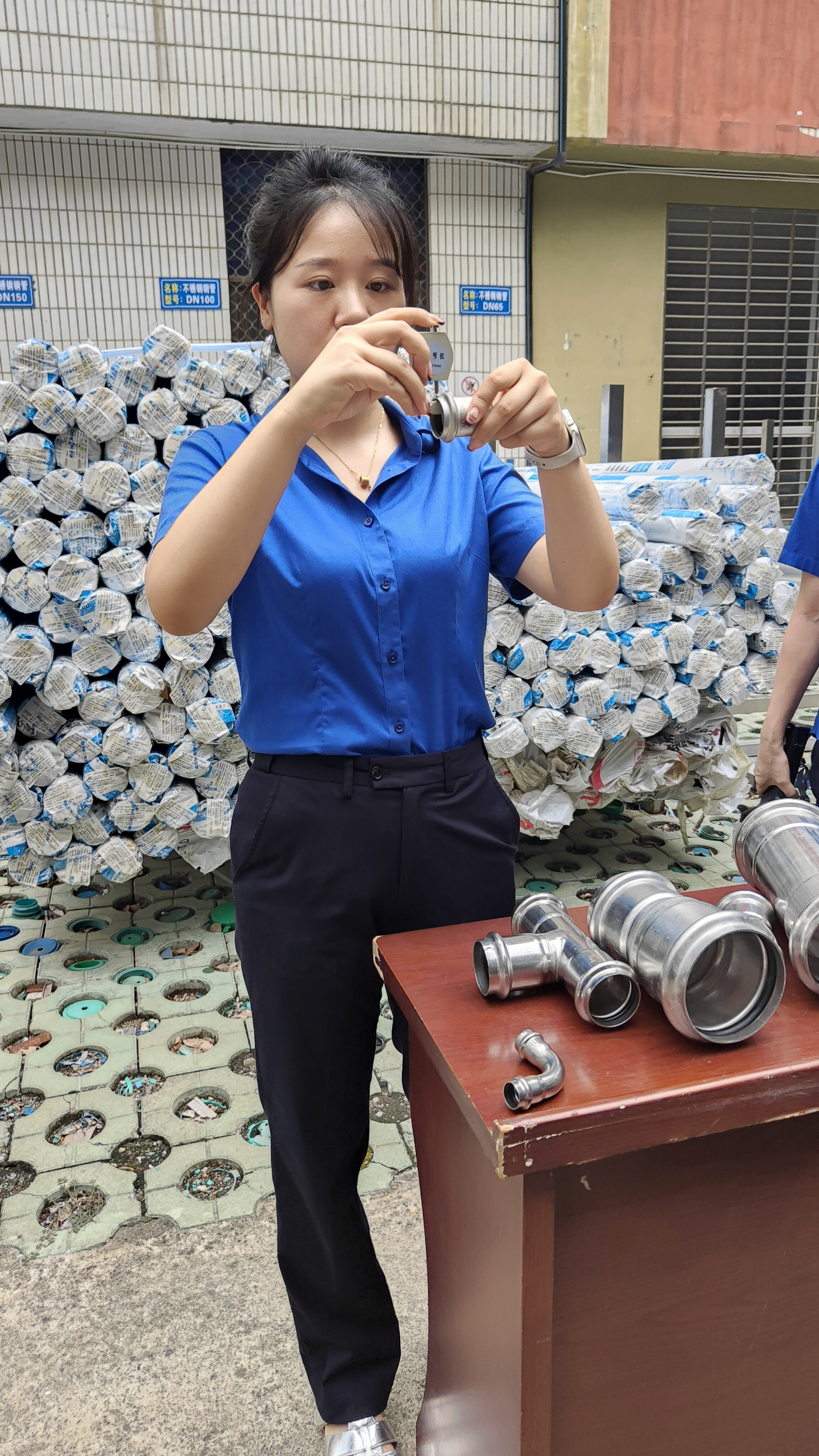 在實(shí)操比武環(huán)節(jié),參賽人員按流程對各類型號管件進(jìn)行鑒別與檢驗(yàn):運(yùn)用手持光譜儀檢測不銹鋼材質(zhì)成分,確認(rèn)是否符合不銹鋼304標(biāo)準(zhǔn);使用測厚儀測量管件壁厚,嚴(yán)格把控尺寸偏差;用卷尺測量長度,核對與標(biāo)準(zhǔn)值的誤差。整個比武過程規(guī)范有序,參賽人員嚴(yán)謹(jǐn)操作,展現(xiàn)了扎實(shí)的驗(yàn)質(zhì)功底。