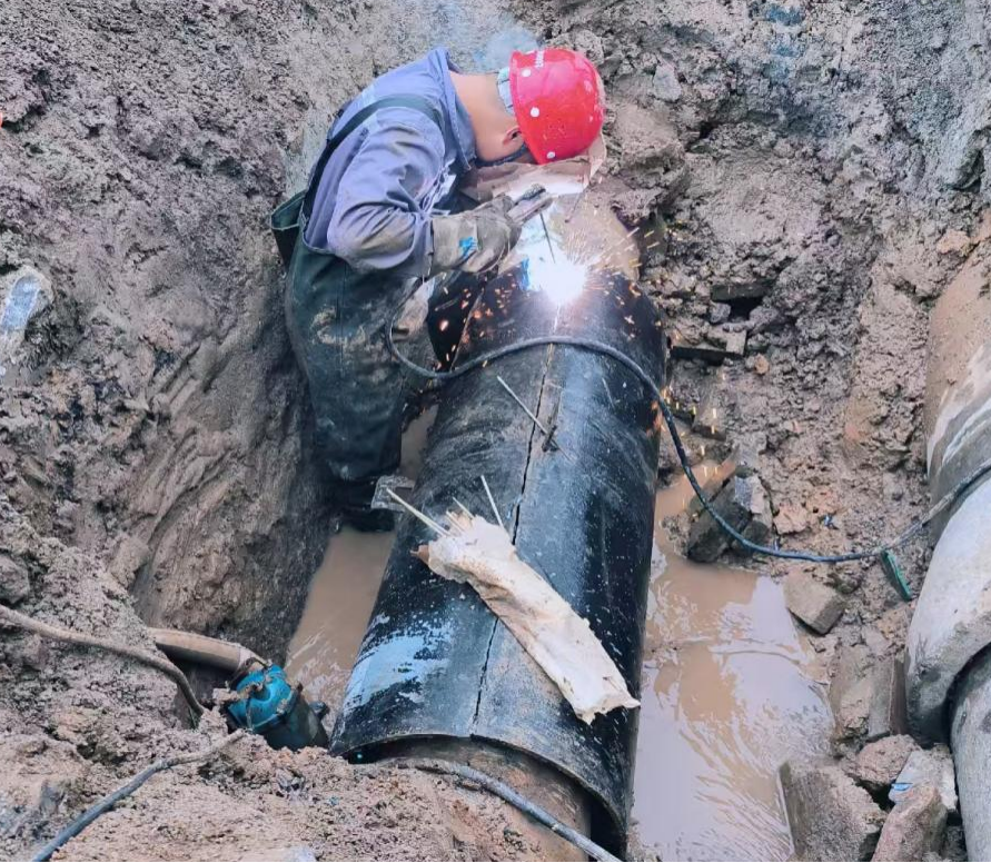 施工現場情況復雜,故障管道埋深達3米,搶修人員頂風冒雨,克服重重困難,加速完成管道清理、融口焊接,歷經4小時恢復正常供水。