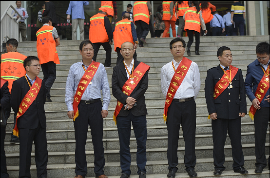 荊門(mén)市勞動(dòng)模范、供水總公司黨委書(shū)記、總經(jīng)理陳永根(右二)上臺(tái)接受頒獎(jiǎng)。