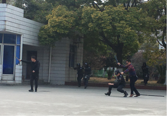 本次演練以在全國“兩會”召開前夕,2名暴恐份子密謀在市供水總公司三水廠采取投毒方式實施暴恐襲擊為背景展開。市公安局指揮中心接到水廠員工報案,2名暴恐份子駕車攜帶劇毒氰化物和匕首來到三水廠,密謀投毒、傷人。市公安局指揮中心立即派轄區(qū)派出所和巡邏組前往處置。在投毒失敗后,嫌疑人刺傷安保人員并挾持人質(zhì),與民警對峙。隨后,市公安局迅速啟動反恐防范一級響應(yīng),調(diào)派轄區(qū)分局、巡特警、刑偵、交警等部門趕赴現(xiàn)場開展工作。短短3分鐘,暴徒迅速被控制,其中有一名暴徒被當(dāng)場擊斃,人質(zhì)被成功解救。之后,120急救中心趕往現(xiàn)場救治,同時環(huán)境監(jiān)測部門迅速開展水質(zhì)檢測評估,確保水廠供水安全。至此,反恐防暴演練活動順利結(jié)束。