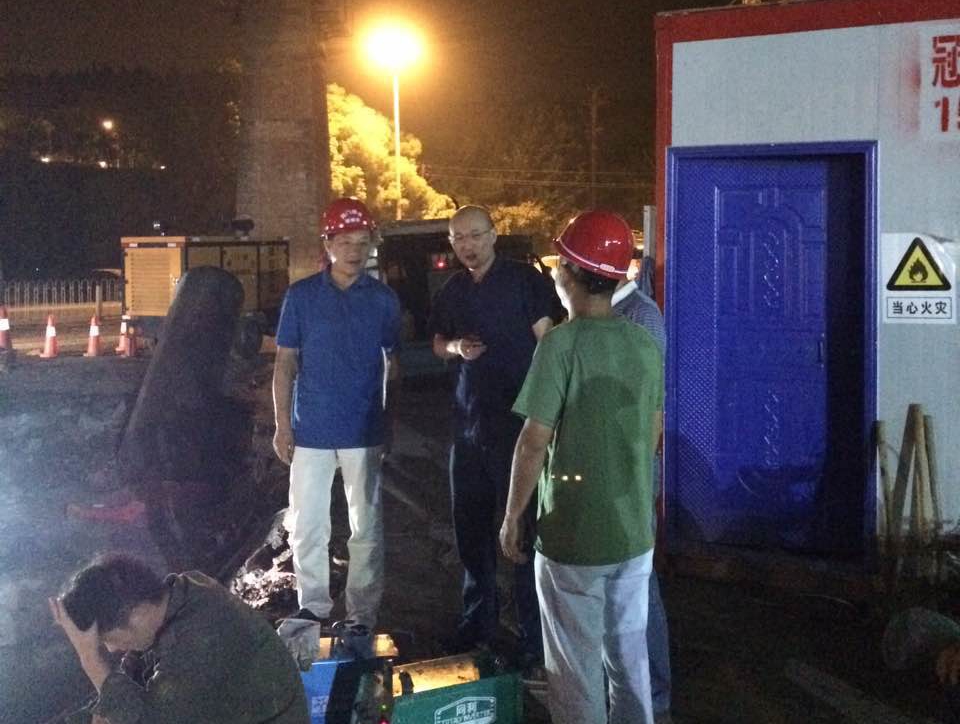此次施工任務(wù)重、時(shí)間緊、戰(zhàn)線長、交叉作業(yè)多、未知因素多,市供水總公司科學(xué)組織、準(zhǔn)備充分、措施有力,創(chuàng)造了荊門供水單次停水施工碰頭數(shù)量最多、停水時(shí)間最短的歷史紀(jì)錄!此次施工前,市供水總公司審時(shí)度勢,啟動(dòng)了應(yīng)急預(yù)案,從人員、物資、設(shè)備、應(yīng)急搶險(xiǎn)等各方面都做了充分準(zhǔn)備。當(dāng)晚,公司黨委書記、總經(jīng)理陳永根親臨施工現(xiàn)場,坐鎮(zhèn)一線指揮,要求相關(guān)部門集中力量,全力配合,爭取在最短的時(shí)間內(nèi)完成施工,盡快恢復(fù)供水。在爭分奪秒的施工過程中,全體參戰(zhàn)單位和人員在總公司領(lǐng)導(dǎo)正確指揮下,發(fā)揚(yáng)"特別能吃苦、特別能戰(zhàn)斗、特別能奉獻(xiàn)"的“供水鐵軍”精神,團(tuán)結(jié)一心,眾志成城,密切配合,群策群力,譜寫了供水人敢與時(shí)間賽跑、敢同困難較勁的“合奏曲”。維修公司、安裝公司、營抄中心工作人員作為搶修主力軍,在悶熱的坑洞下和污濁的泥水中實(shí)行分班作業(yè)、輪流施工,艱苦作業(yè)。職能部門管網(wǎng)運(yùn)維部、工程管理部、客服中心、水質(zhì)檢測公司積極發(fā)揮統(tǒng)籌協(xié)調(diào)能力,調(diào)度應(yīng)急供水車緊急供水、調(diào)配管材物質(zhì)、快速水質(zhì)化驗(yàn)……竭盡全力地為DN1000管道碰頭施工保駕護(hù)航。