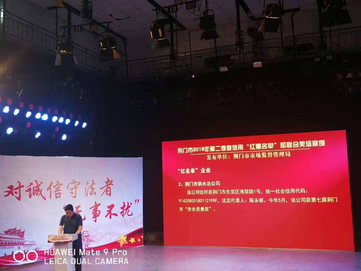 7月24日下午,荊門市社會信用體系建設領導小組辦公室、市發(fā)改委、人行荊門市中心支行聯合組織召開第二季度信用“紅黑名單”和聯合獎懲案例發(fā)布會。會上,市供水總公司被授予“全市市場監(jiān)管領域守信企業(yè)”榮譽稱號,入選荊門市守信企業(yè)“紅名單”。