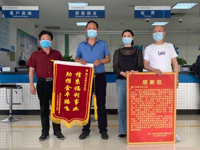5月15日上午,荊門市金豐新材料有限公司總經(jīng)理袁家群和東寶區(qū)工商聯(lián)相關(guān)負責人來到市供水總公司,送上感謝信和寫有“情系福利事業(yè) 助推金豐騰飛”的鮮艷錦旗,以感謝市供水總公司想企業(yè)之所想、急企業(yè)之所急,用實際行動踐行初心使命,助推企業(yè)復工復產(chǎn)。