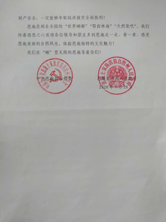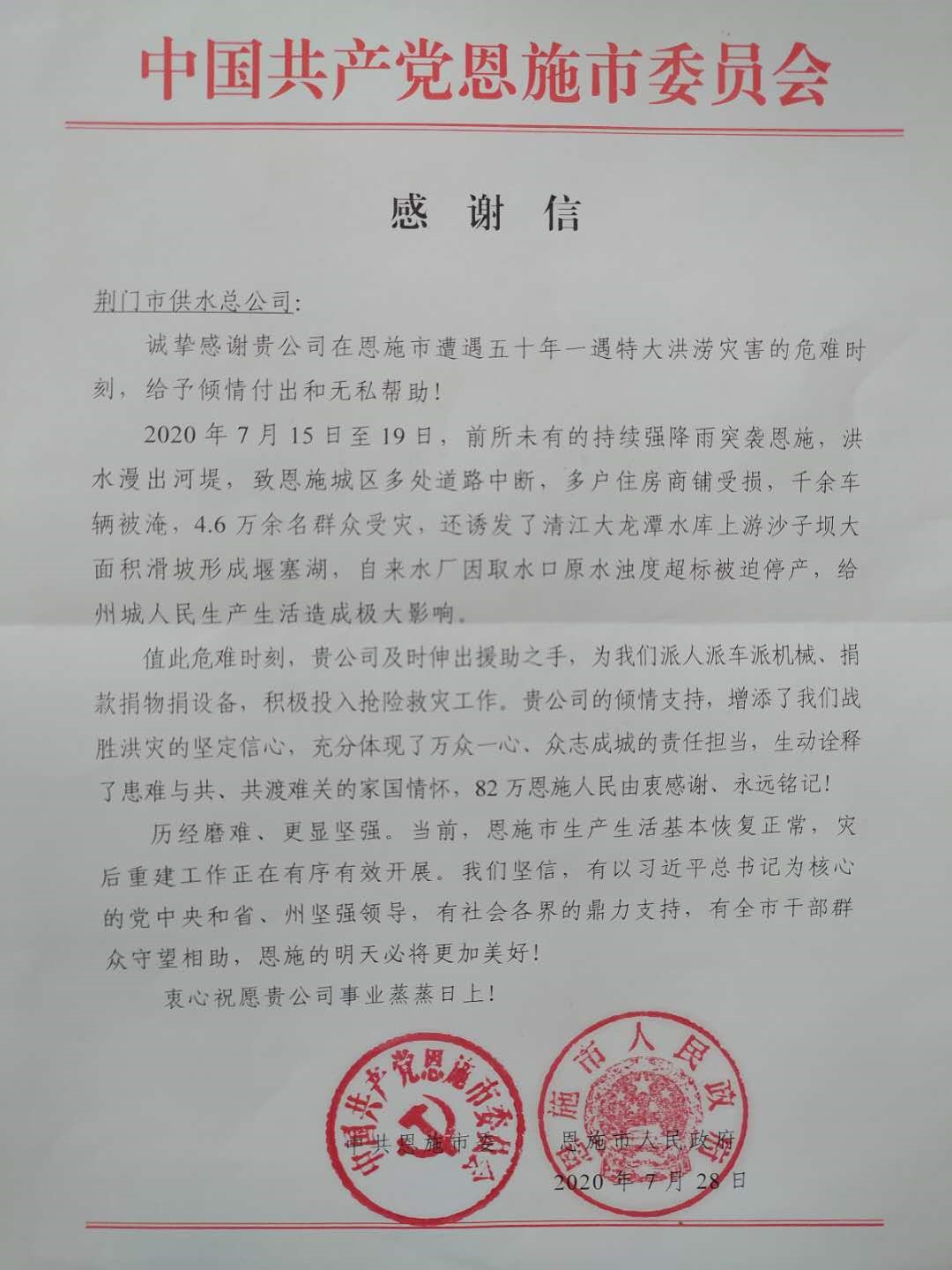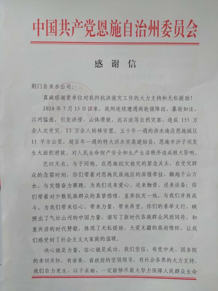 恩施州市兩級黨委、政府向市供水總公司發(fā)來感謝信