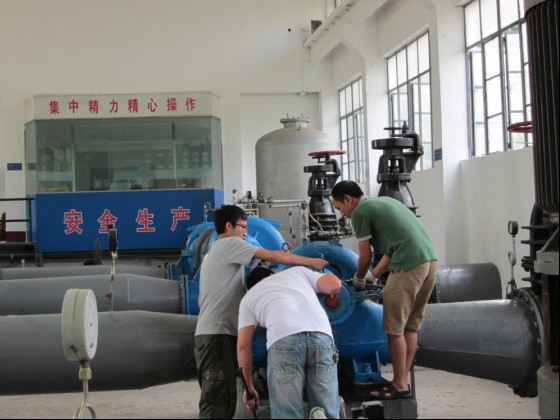近日,氣溫逐漸攀升,為確保高峰供水時供水設(shè)備的正常運(yùn)行,市供水公司加壓站組織維修人員搶前抓早、多措并舉,加強(qiáng)對供水設(shè)施、設(shè)備的維修保養(yǎng)。圖為加壓站維修人員在維護(hù)3#送水泵。